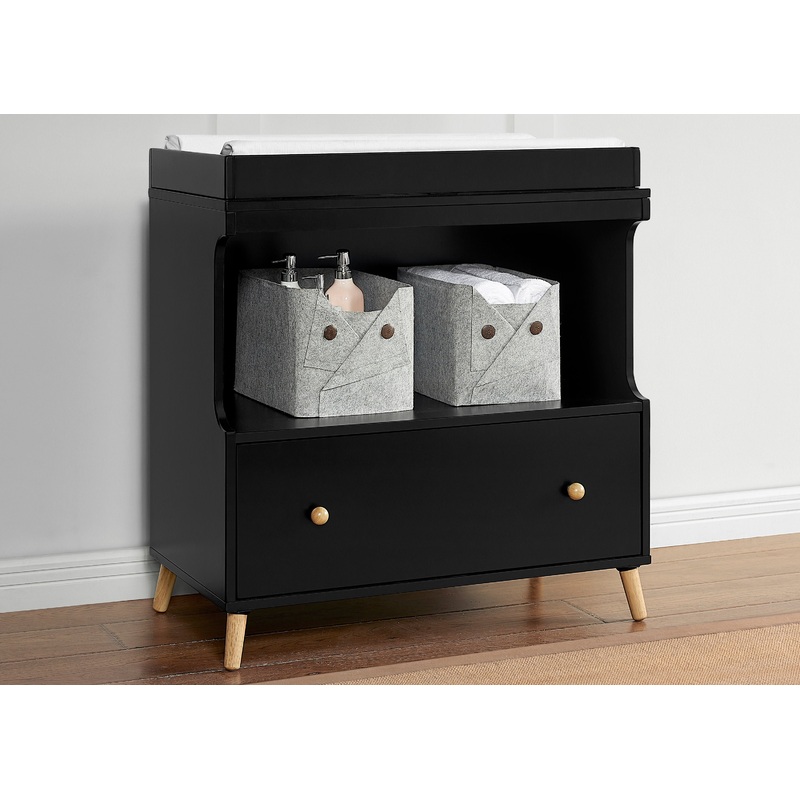 The Essex Convertible Changing Table with Drawer by Delta Children offers all the essentialsa secure place to change your baby, plus a drawer and open cubby for all of your storage needs. A new take on iconic mid-century style, it features simple lines and