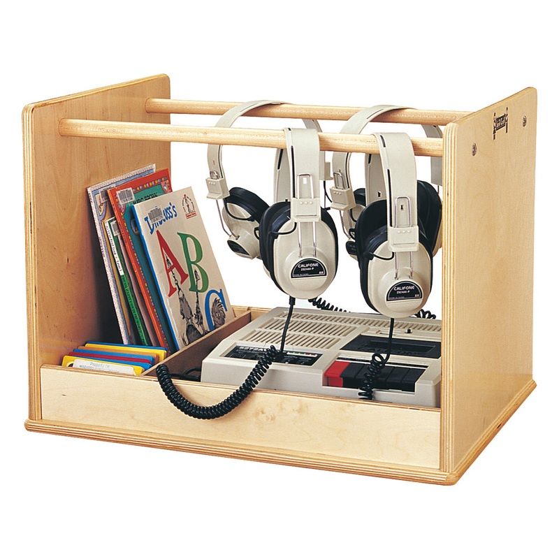 Portable listening center. Holds audio player, eight headphones, with partitions for books, CDs or cassette tapes. Birch and maple construction. 17 lbs. 15.5" High x 15" Wide x 20" Deep. Lifetime warranty.