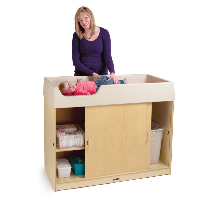 Change young childrens diapers and clothes with comfort and safety. Extra deep plastic rails exceed recommended safety standards and an included comfy changing pad make it easy to change young childrens diapers and clothes. Lockable, sliding doors conceal