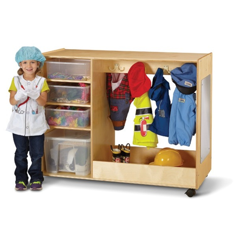 Keep costumes organized and handy with this mobile unit. Designed to hold costumes, hats, and many other pretend play accessories for even the most imaginative children! The included six clear Tubs and one clear Jumbo Tote with lid make it easy to store sm