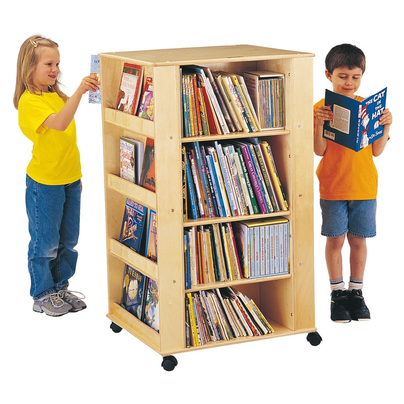 Two sides to display and two sides for storage in one unit. The eight display shelves are fixed, while six of the book shelves are adjustable. Displays are approximately 2.5″ deep. Shelves are 18_” wide x 11″ deep.