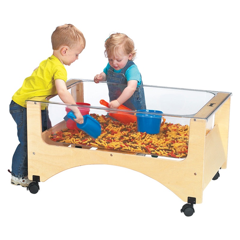 Provides ultimate splash control with clear, tuff, nine-inch deep acrylic tub. Matching see-thru acrylic activity cover included. Locking casters.